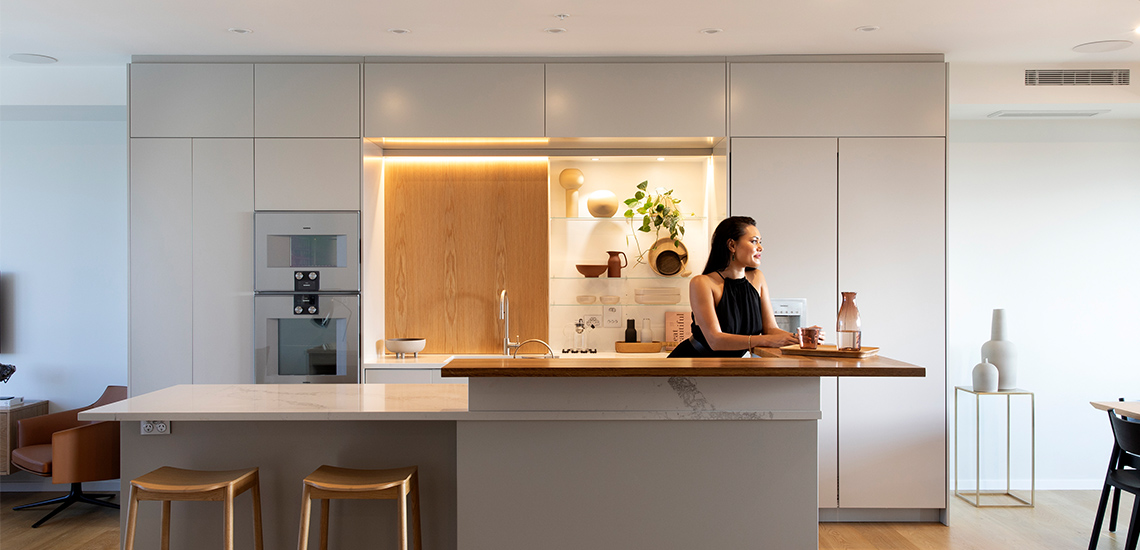The apartments have living and dining areas either-side of a central kitchen. Natural stone features throughout the master ensuite and the master bedroom looks back over the city. The rooftop which houses a swimming pool and spa pool, along with a gas fireplace and barbeque ensures the rooftop is fit for entertaining and hiring out for private functions.